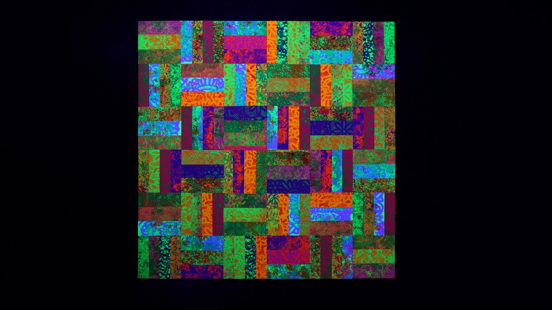 Ultraviolet culminates a body of work (collage, animation, and pre-cinematic optical toys) that glows under blacklight, uniting my previous work in posters and textiles with my ongoing sublimation of art and craft. Somewhere between psychedelic posters and neon-stained glass windows, each quilt mourns a loved one who experienced addiction before their death. The flat quilts and screens seek impossible comfort. The patterning of collages echo the [de]formation of habit, central to the experience of addiction, not just to substance but labor itself. The repetition of the circular discs (phenakistoscopes) and looping animations relapse on repeat. The still works provide the basis for “animation”: exuberant yet mournful in pace, animating life and also grief. From fluorescent rocks in Franklin, N.J., to the glow décor aesthetics of Party City, Ultraviolet is a collision of the real and replica, revealing the vast unseen complexities of the human experience, what is invisible to the sun.